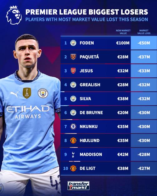 本赛季英超身价下跌榜:福登身价降5000万欧领跑,曼城占四席