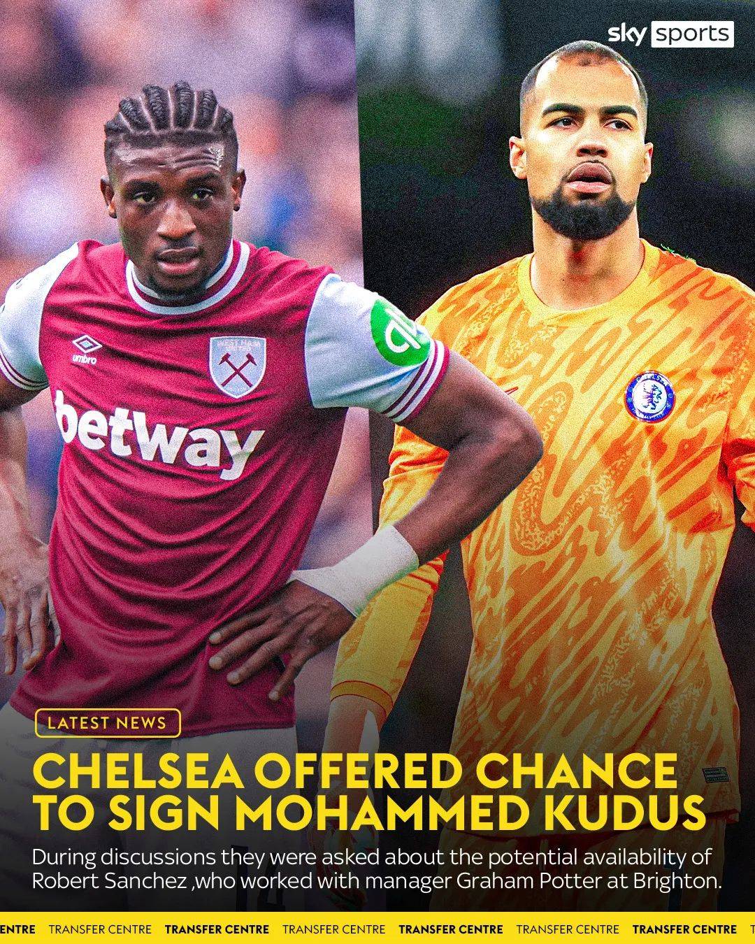据悉,库杜斯的合同中含解约条款,针对沙特球队解约金数额为1.2亿镑,针对英超球队为8500万镑,解约条款现在已经生效。他被认为在马雷斯卡的转会愿望清单上名列前茅。马雷斯卡希望通过提供包括罗伯特·桑切斯、霍尔、阿达拉比奥约、查洛巴、巴迪亚希勒、迪萨西以及中场球员丘库埃梅卡在内的7名球员,同西汉姆联完成球员交换。