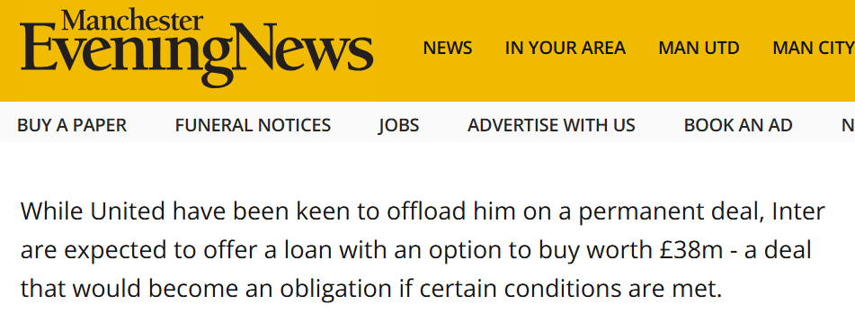 虽然曼联希望直接永久出售,但霍伊伦德的拙劣表现,意味着不存在这样的买家。故此,预计国米的3800万英镑先租后买合同,足以说服俱乐部同意放行。据悉,租借合同将约定,一旦霍伊伦德的表现达到一定标准,这支本赛季意甲和欧冠亚军球队将有义务买断。