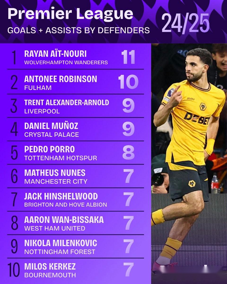 本赛季英超后卫参与进球榜:艾特-努里11球位列第1、阿诺德第3
