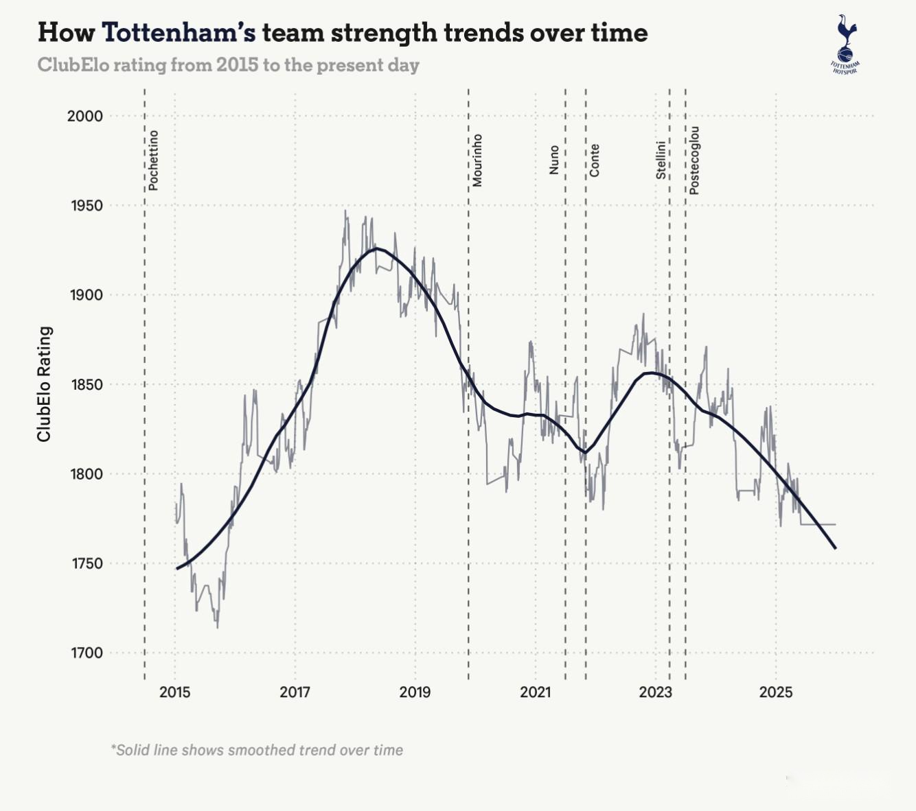 要理解列维为何放弃这位带来冠军的教练,只需看看2024/25英超积分榜:第17名是热刺自1977年降级以来最差排名,22场失利创赛季纪录,57.9%的败率队史最糟。Elo评分显示,波斯特科格鲁两年任期内球队实力急剧下滑。