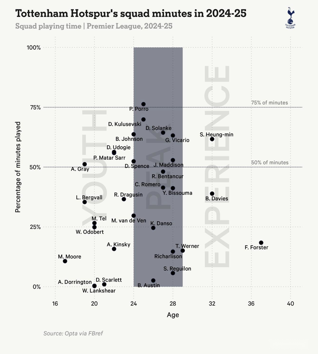 什么导致如此灾难性的联赛成绩?澳大利亚人从不回避现实,但他要求结合背景评判。关键是毁灭性的伤病危机:罗梅罗和范德芬缺阵近四个月,维卡里奥踝关节骨折休战三月,赛季末库卢塞夫斯基和麦迪逊因膝伤缺席。下图显示仅有波罗出战超过75%的联赛时间。