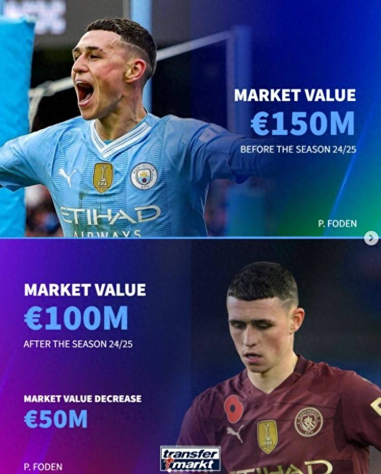 上赛季曼城夺得了英超历史首个四连冠,而本赛季曼城就四大皆空,蓝月军团战绩拉胯,曼城球员身价也纷纷下滑。德转不久之前更新了英超球员的身价,相比赛季初,其中降幅最多的8位英超中曼城占据半壁江山,而福登本赛季身价暴跌半亿欧元排名榜首。