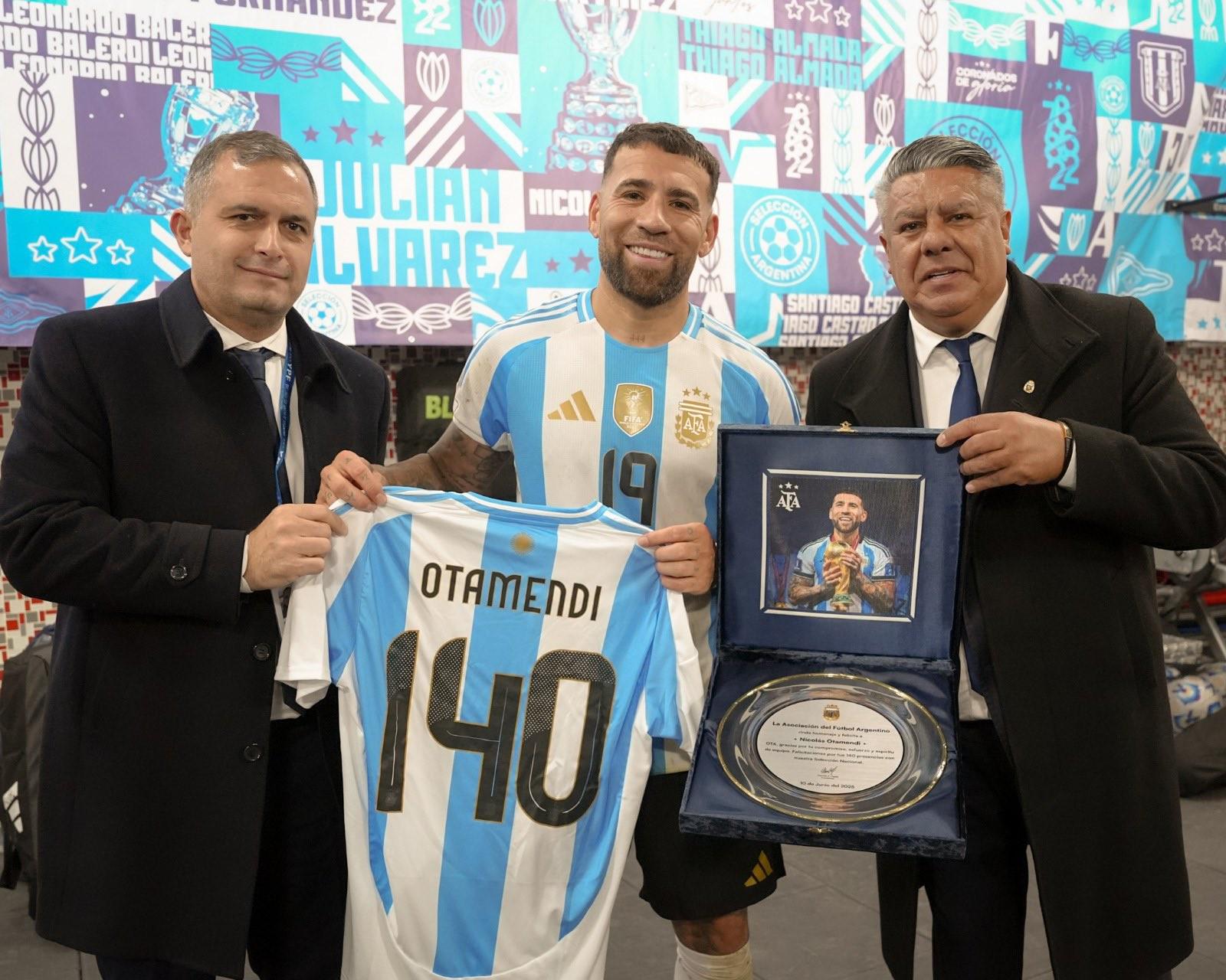 赛后,阿根廷国家队官方账号分享图片显示,奥塔门迪收获国家队140次出场的纪念球衣与礼物。
