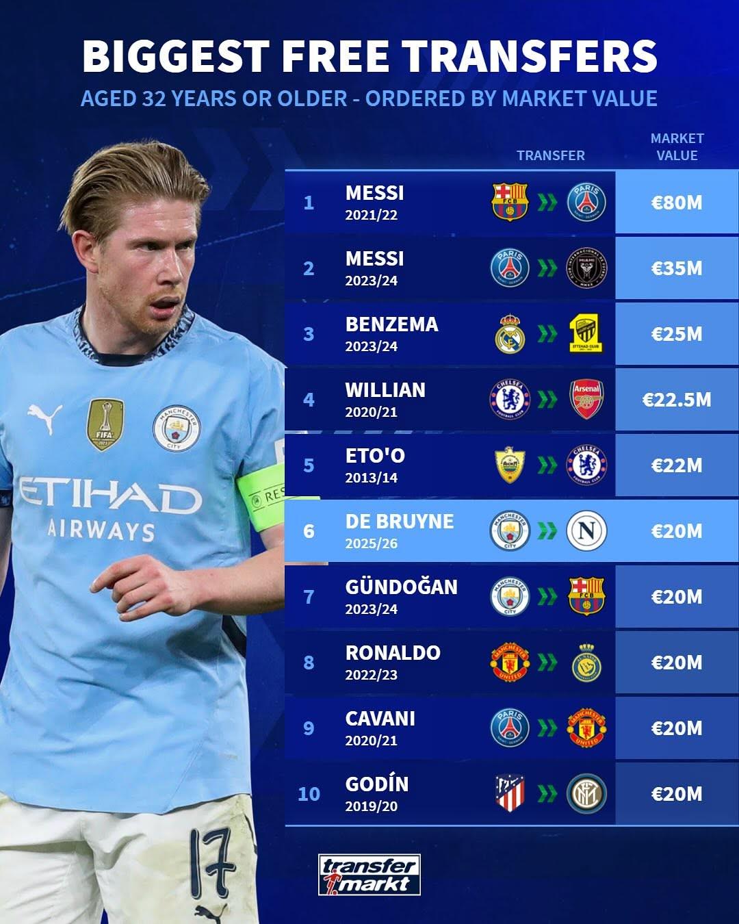 32岁及以上自由转会球员身价榜:德布劳内第六,梅西独揽前二