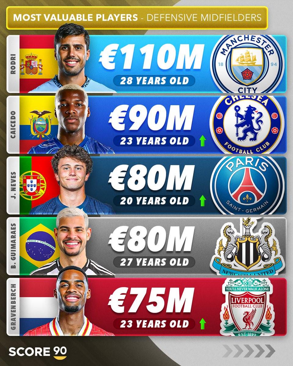 曼城中场罗德里以1.1亿欧元位列榜首。切尔西的莫伊塞斯-凯塞多以9000万欧元排名第二。巴黎圣日耳曼的若昂-内维斯和纽卡斯尔中场吉马良斯同为8000万欧元,并列第三。利物浦的赫拉芬贝赫则以7500万欧元位列第五。