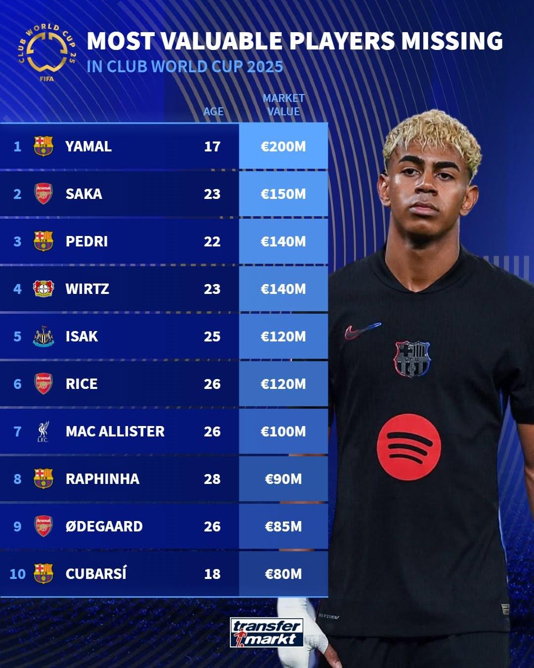 缺席世俱杯球员身价榜:亚马尔2亿欧居首,萨卡、佩德里等在列