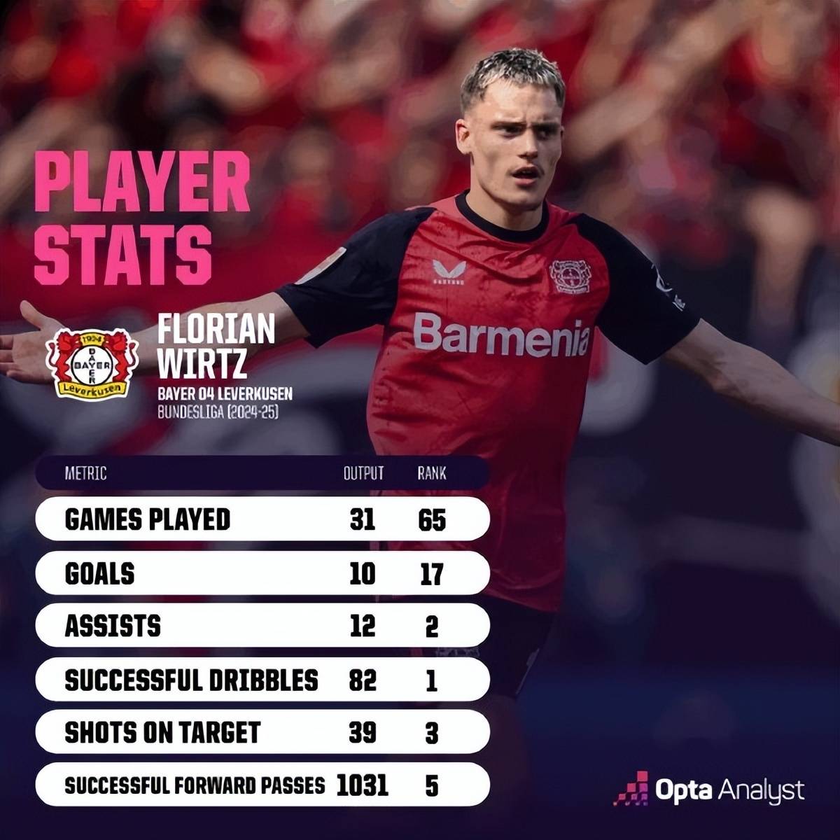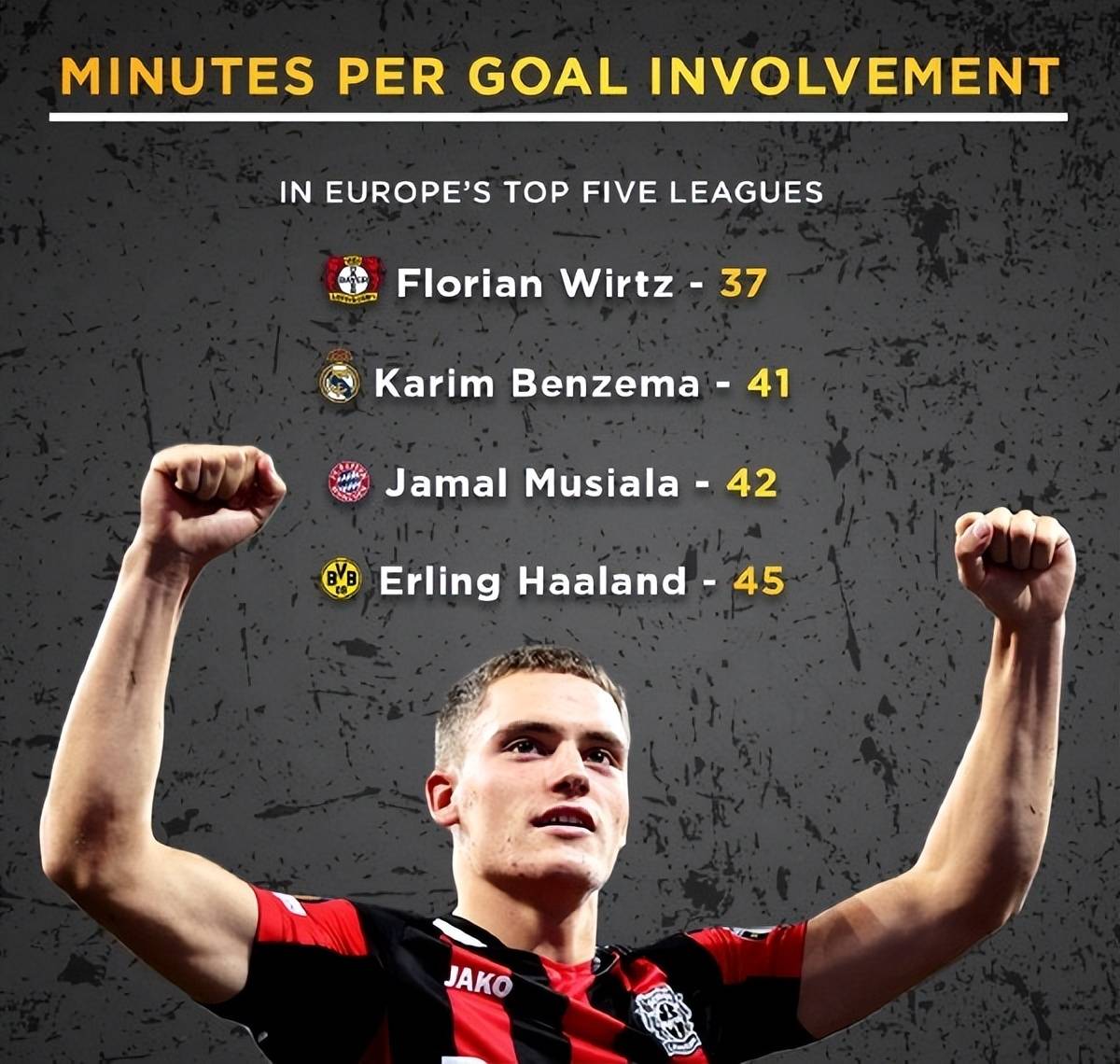 2021-22赛季,当时只有18岁的维尔茨在赛季开局阶段,创造出每37分钟就带来1个进球的神奇数据,一度高位五大联赛效率榜第一。
