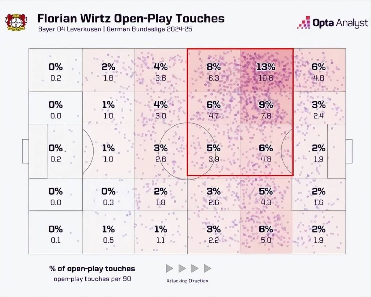 维尔茨在这一波进攻中,充分展现出他在走位方面的天赋。中场推进时,队友撞墙配合,他早就在空位等待。