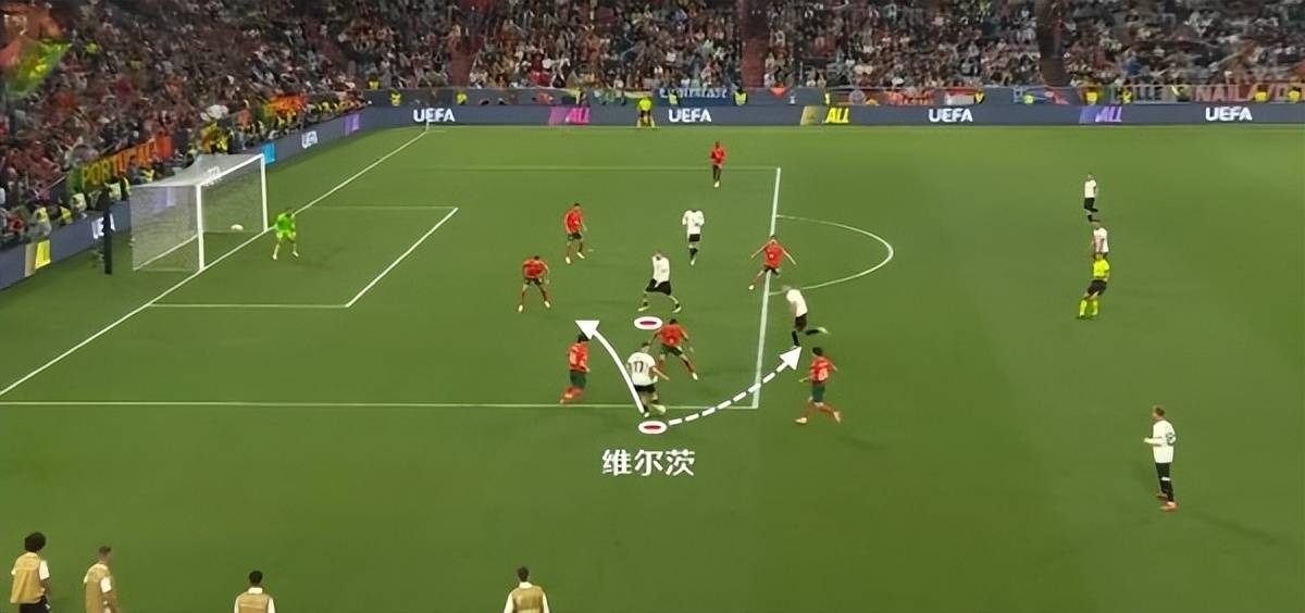 不过在第一波传球失败之后,维尔茨随后抓住了葡萄牙防守人懈怠的一瞬间,突然无球前插,接应到基米希妙传,随后头球破门。