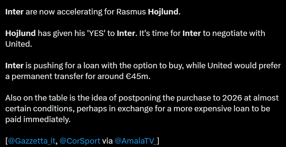 意大利消息人士称,曼联对永久出售霍伊伦德更感兴趣,并且希望得到3400万英镑到3800万英镑。但国米似乎没能力一举支付如此高价,他们更倾向于签订带有买断条款的租借合同,具体地说是下赛季租借,附带2026年买断义务。