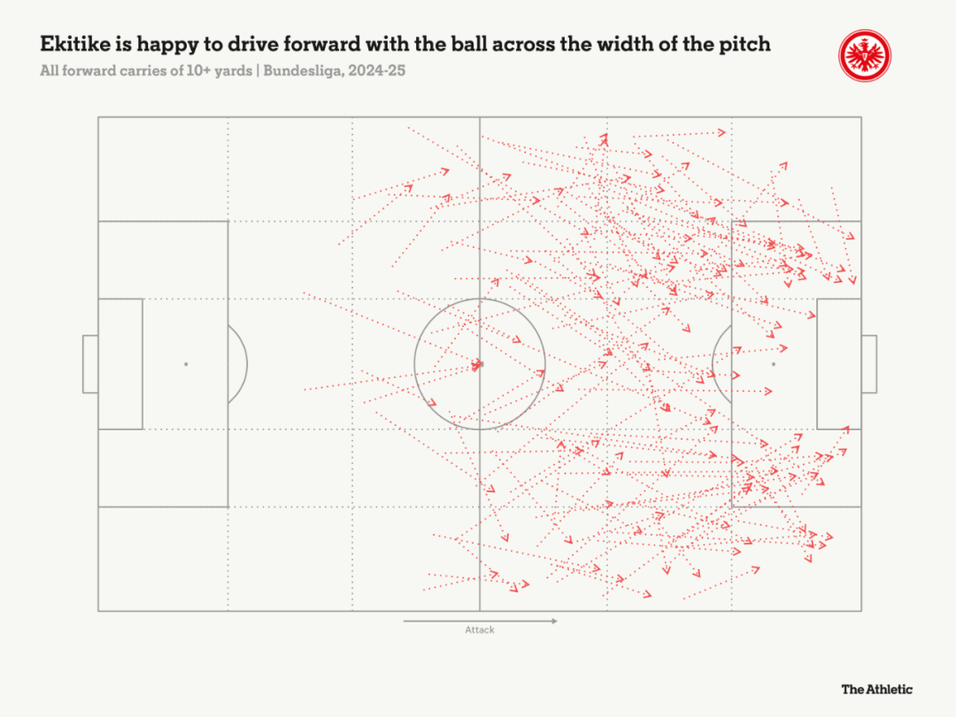 这首先归功于埃基蒂克的速度,如果加盟曼联,他将是队内速度最快的球员,上赛季他的冲刺极速达到了35.5公里/小时。本队控球时,埃基蒂克喜欢向前推进,带球进入对方禁区。一项数据显示,在2024/25赛季,只有已经去了皇马的姆巴佩,完成了比他更多的10码或以上的带球推进并让球队完成射门。