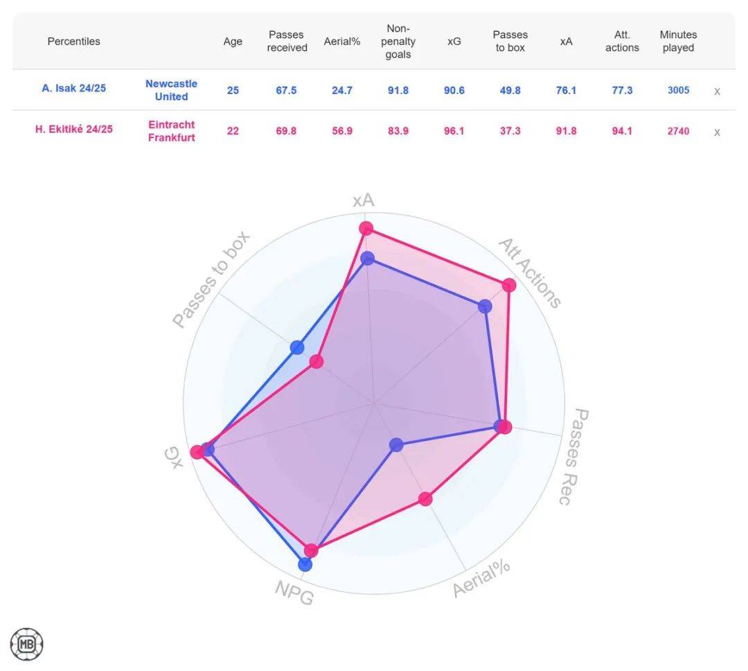 埃基蒂克在禁区内踢得非常聪明,而且动作速度也很迅速。在刚结束的2024/25赛季,只有姆巴佩、莱万多夫斯基、拉菲尼亚和萨拉赫创造了比他更多的预期进球数和预期助攻数。