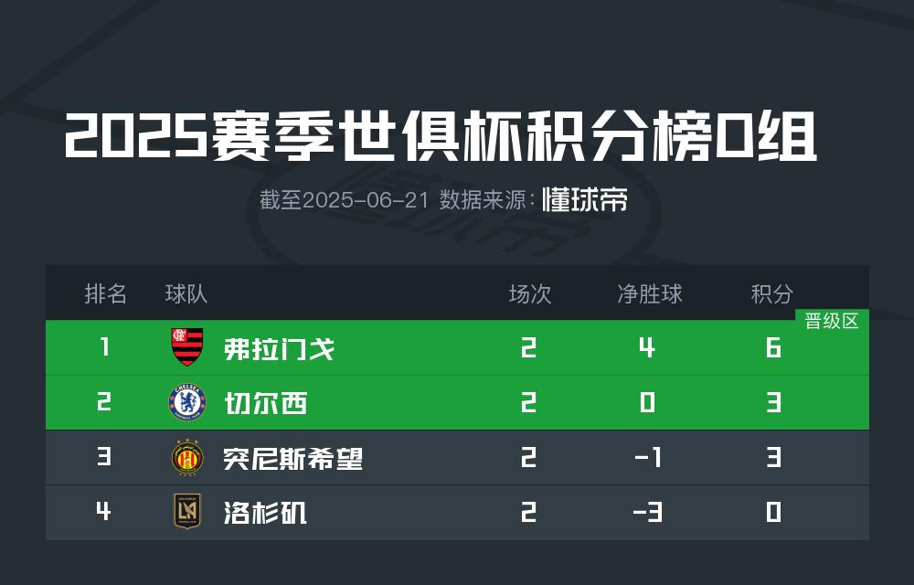 2025年世俱杯D组小组赛前两轮战罢,在洛杉矶FC0-1突尼斯希望的比赛后,弗拉门戈已经锁定小组出线名额,洛杉矶FC出局。切尔西和突尼斯希望同积3分,在最后一轮将迎来直接交手,切尔西打平即可出线。