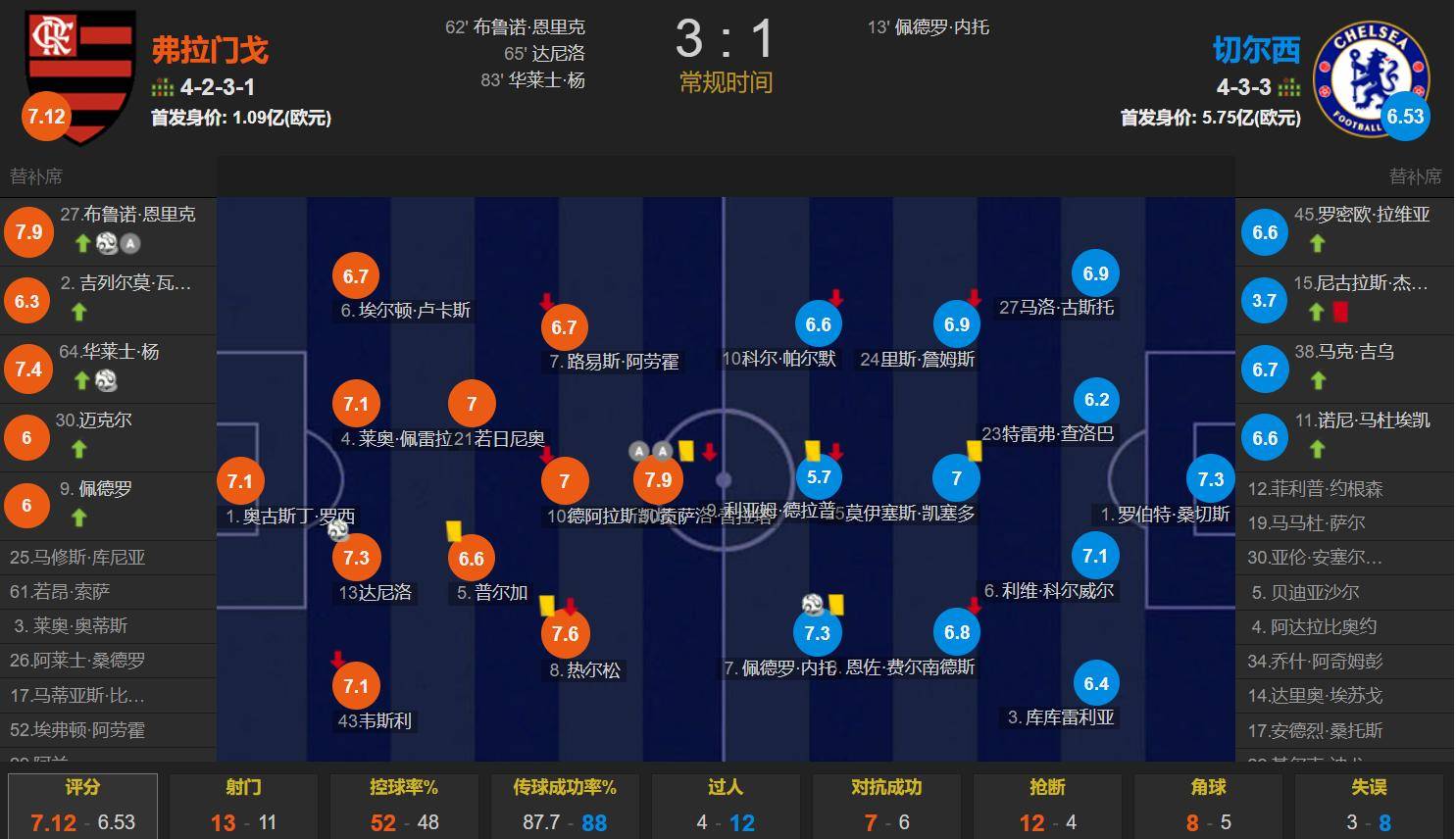 弗拉门戈3-1切尔西!切尔西给英超,给欧洲足球丢面了。此役,切尔西两大中锋,新援中锋德拉普首发梦游,赛后获得5.7分,不及格,首发22人最低分;另一位中锋杰克逊替补出场4分染红,赛后获得最低的3.7分。蓝军中锋位置真是拉胯,球迷调侃帕尔默和杰克逊是没头脑和不高兴,或许部分蓝军球员被高估了。南美球队先是揍了欧冠冠军,再是揍了欧协联冠军,南美球队前9场6胜3平保持不败。