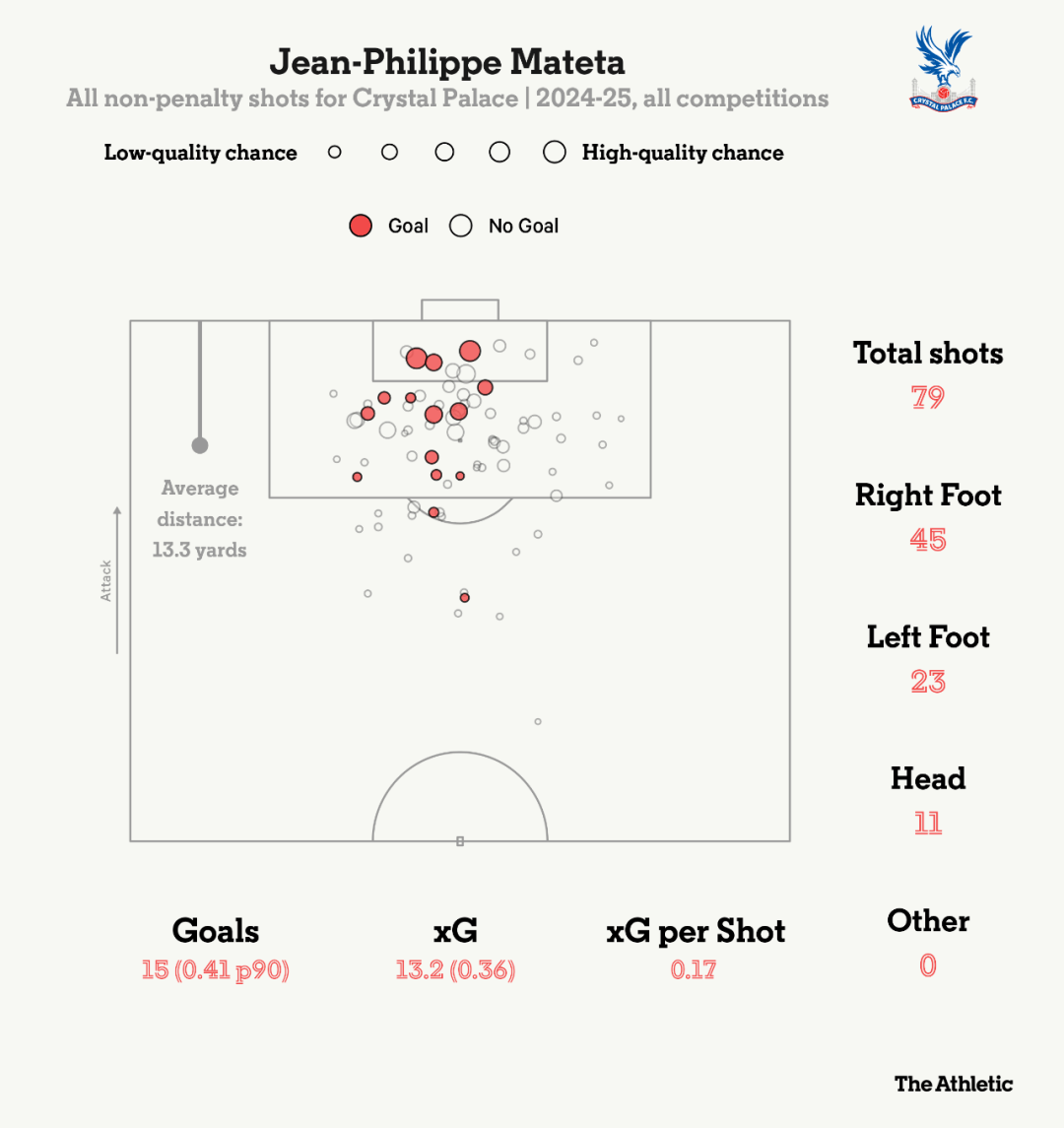 还有几个与曼联联系紧密的前锋,其中最保险的可能是水晶宫的让-菲利普·马特塔,他是一个久经考验的英超联赛前锋。27岁的法国前锋自2023年12月以来,已经有30个英超进球,帮助水晶宫夺得足总杯。