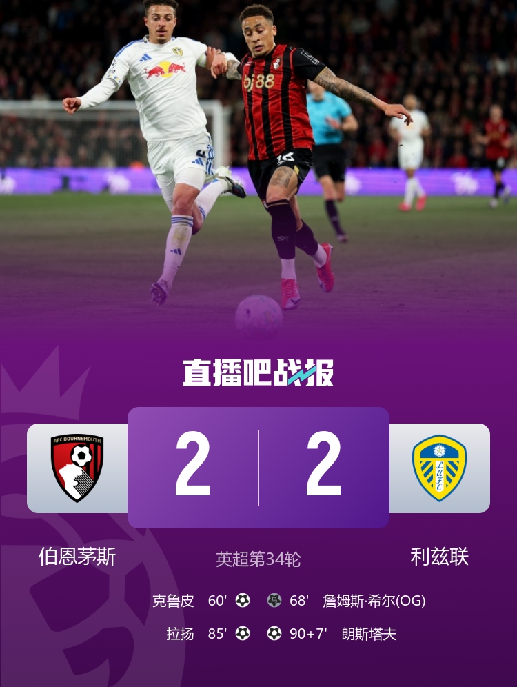 4月23日讯 北京时间4月23日凌晨3:00,2025-26赛季英超联赛第34轮,伯恩茅斯坐镇活力球场迎战利兹联。上半场两队均无建树,暂0-0战平;下半场塞内西助攻克鲁皮破门,奥卡福中柱,詹姆斯·希尔乌龙,拉扬替补破门,埃瓦尼尔森进球被吹,朗斯塔夫读秒绝平,最终伯恩茅斯2-2利兹联,联赛14轮不败,积49分来到积分榜第7,利兹联积40分。
