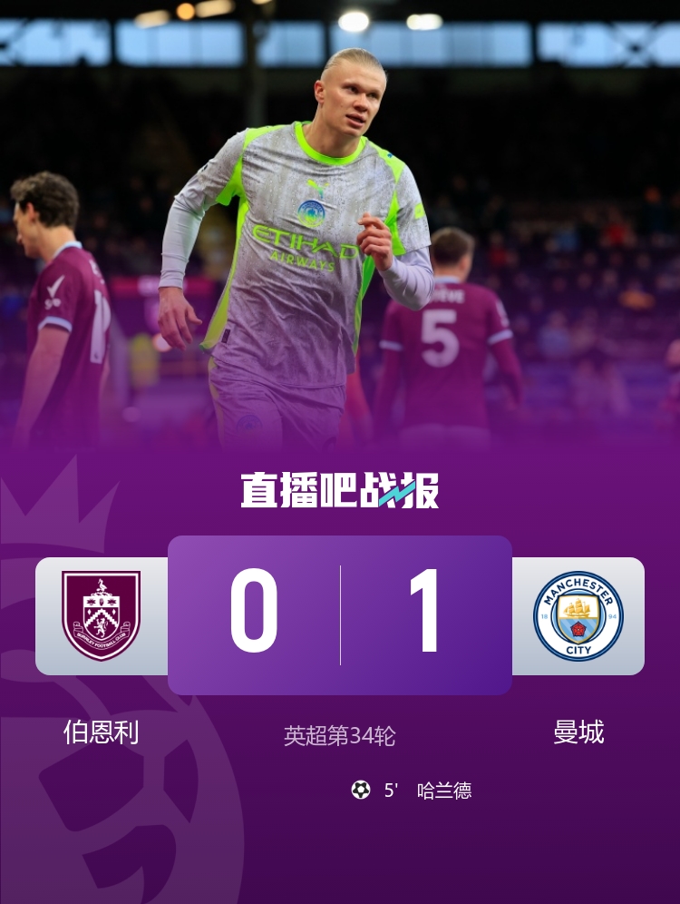 先赛暂登顶!曼城1-0送伯恩利降级 哈兰德单刀闪击制胜+中柱