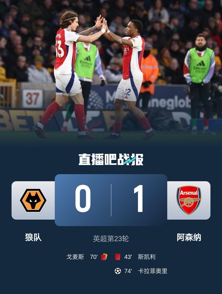 英超-十人阿森纳1-0十人狼队距榜首6分 卡拉菲奥里制胜斯凯利直红
