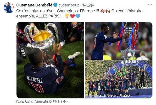 登贝莱难掩激动:“以 5-0 的比分赢下欧冠决赛太不可思议了!赛季初我们欧冠开局不利,但逐渐找回状态,对阵利物浦、阿斯顿维拉、阿森纳时都拿出了顶级表现。”
