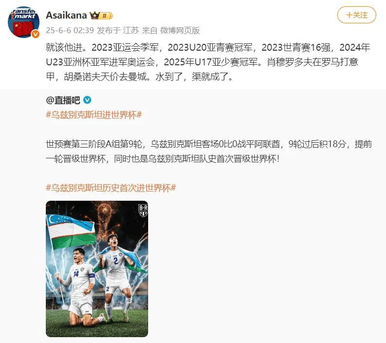 北京时间2025年6月6日凌晨,乌兹别克斯坦国家足球队创造历史。客场0-0战平阿联酋后,乌兹别克斯坦以9轮5胜3平1负积18分的成绩锁定世预赛亚洲区A组第二,提前一轮晋级2026年美加墨世界杯。