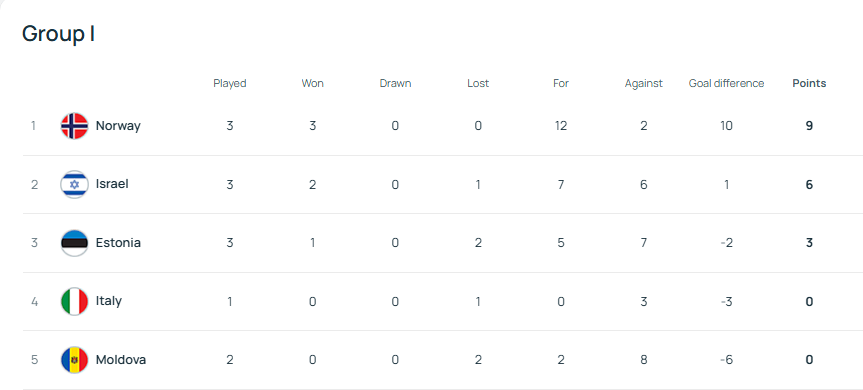 世预赛小组赛,意大利与挪威、以色列、爱沙尼亚和摩尔多瓦同在I组。这一组,意大利和挪威是争夺小组头名的直接竞争对手,但随着意大利客场三球惨败,几乎是无缘小组第一了。