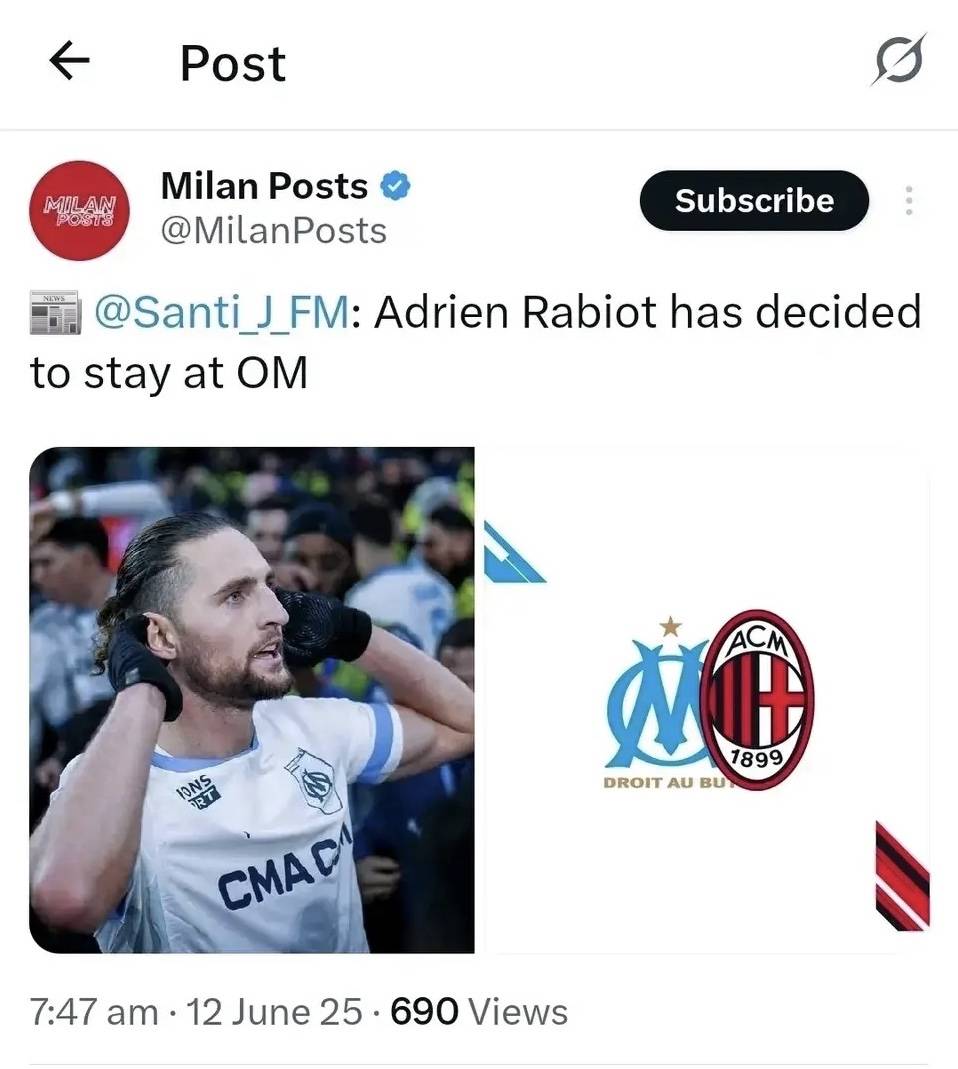 意甲媒体透露:马赛中场球员拉比奥特拒绝加盟米兰,并告知俱乐部自己并不想离开