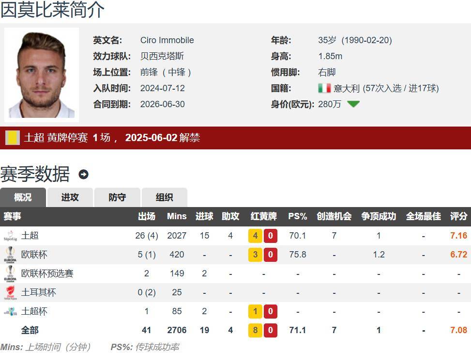 现年25岁的因莫比莱,身高1.85米,右脚中锋,与贝西克塔斯的合同至2026年,德转估价280万欧元。球员去国外踢球,虽然更赚钱,但也会思念家人,回归意甲或许35岁老将因莫比莱延长职业生涯的更佳选择。
