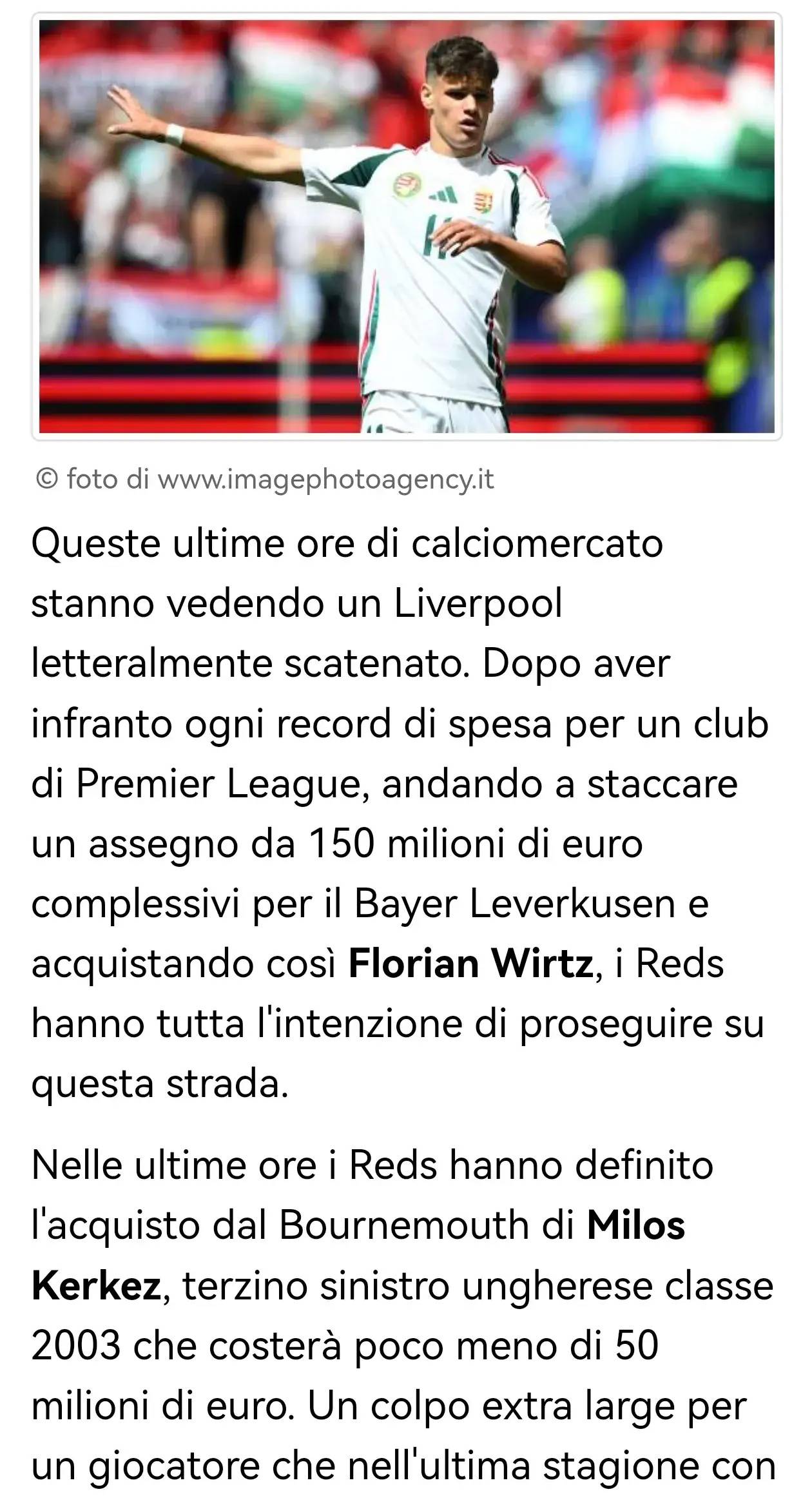 最新动作是从伯恩茅斯敲定匈牙利左后卫米洛什·科尔克兹的转会,这位2003年出生的球员身价接近5000万欧元。上赛季他代表樱桃军团在英超和足总杯累计出场41次,贡献2球6助攻。