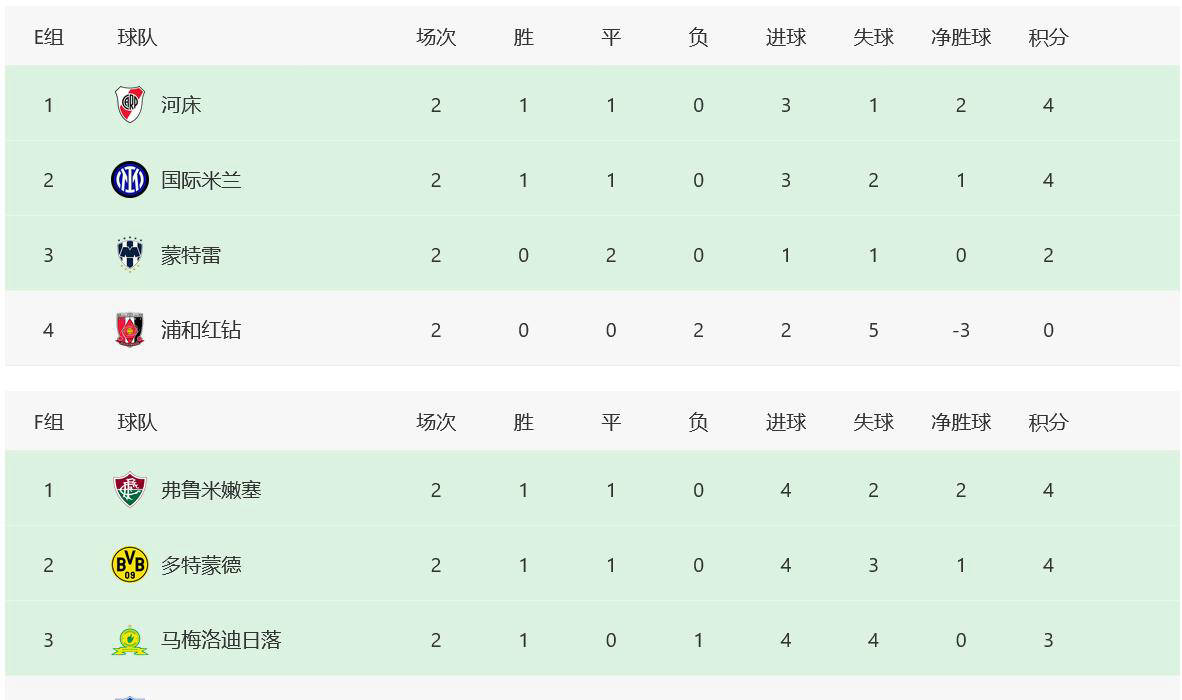 国际米兰首轮1-1战平蒙特雷,本轮以2-1战胜浦和红钻;河床队首轮3-1击败浦和红钻,本轮则被蒙特雷逼平0-0。目前,国际米兰与河床同积4分,但河床以净胜球优势位居小组第一。