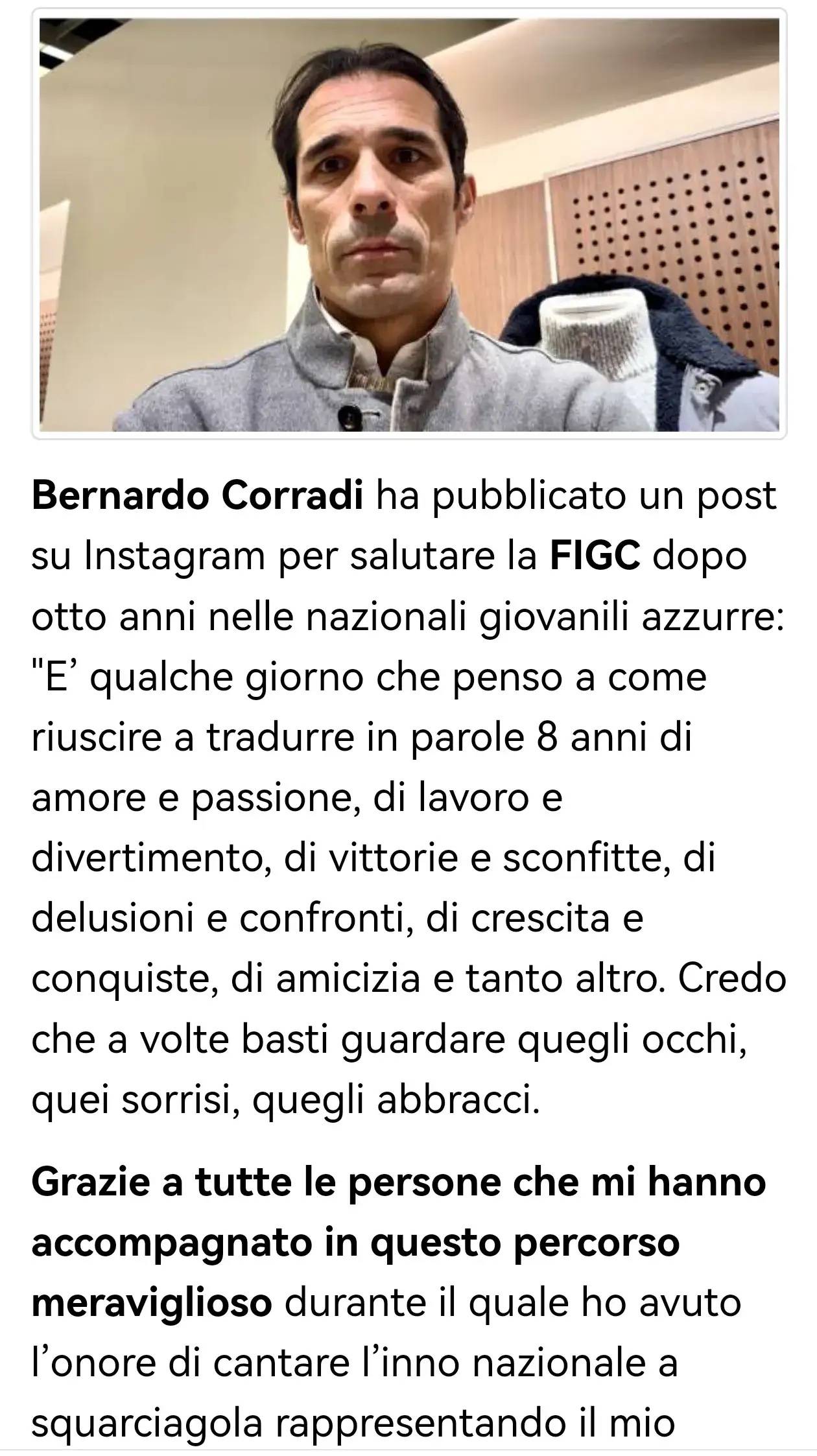 贝尔纳多·科拉迪在社交媒体发文,告别意大利足协(FIGC)八年青年队执教生涯: