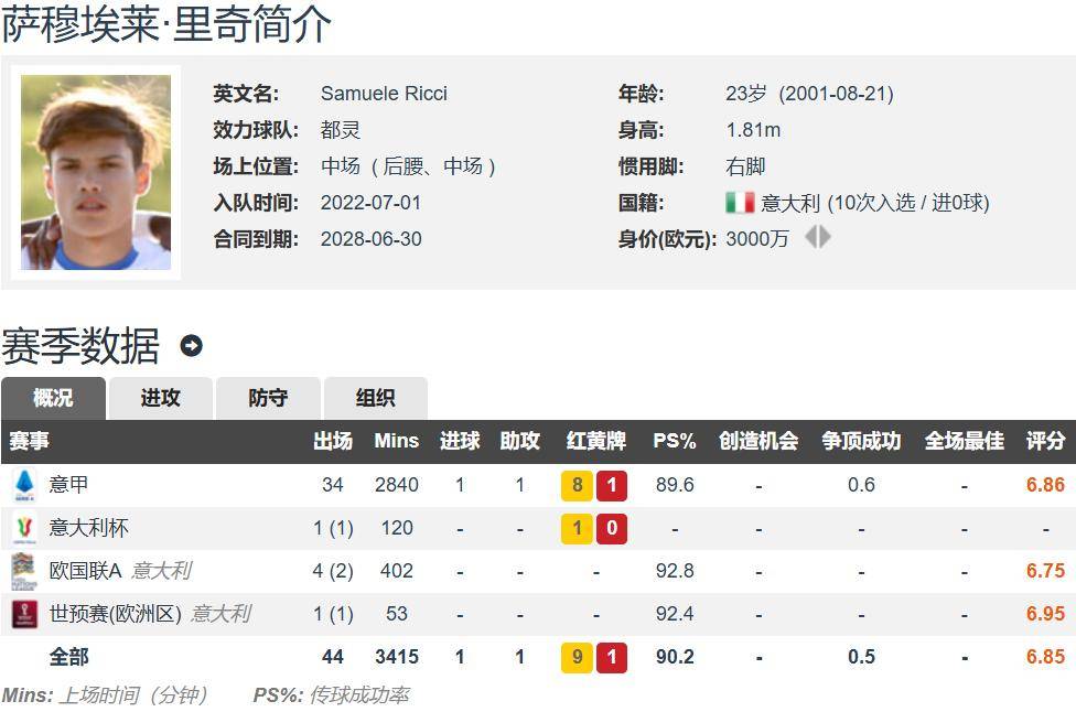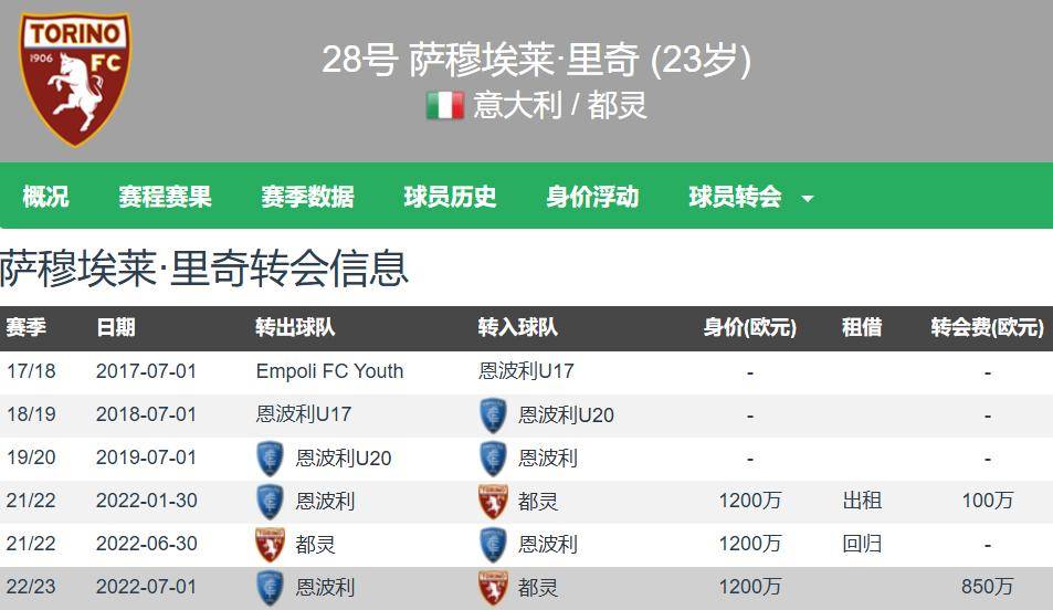 现年23岁的利器,身高1.81米,右脚球员,能踢后腰和中场,与都灵的合同至2028年,德转身价3000万欧元,都灵队内第一身价。里奇上赛季出战了34场意甲的比赛,全部首发,贡献1球1助。