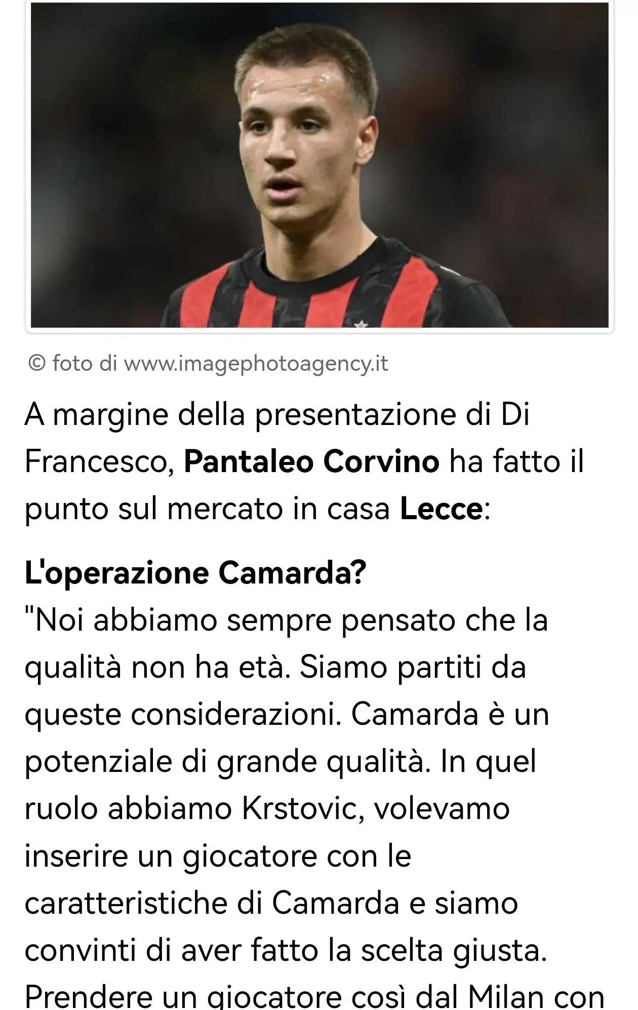 意甲:莱切体育总监谈米兰球员卡马尔达加盟,天赋和年龄无关,我们需要他这样的特点球员