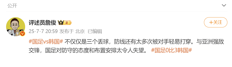 詹俊在赛后更新了社交媒体动态,他就发文表示:“不光是三个丢球,最主要的是防线太多次被对面轻松打穿了,和亚洲强敌的对决,国足防守的态度还有本场的布置让人失望。”下面评论区直接怒吼,让主教练久尔杰维奇下课,还有人说:“你就这个能力神仙难救。”、“瓜迪奥拉来也是一脚就踢穿了。”