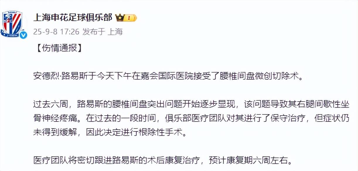 本周末中超重启,联赛进入最后阶段的激烈争夺,但申花却折损一员大将。俱乐部昨天确认,安德烈·路易斯接受腰椎间盘微创手术,预计缺阵6周。