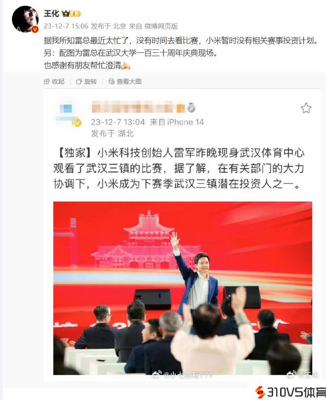小米投资中超球队造谣,王化:小米暂时没有相关赛事投资方案