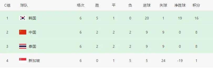 最后全场比赛结束,泰国队3-1战胜新加坡队,中国队、泰国队积分均是8分,而在进球、丢球上也全是一样,但是因为中国队相互战绩占优,中国队排在第2名出线晋级18强赛。