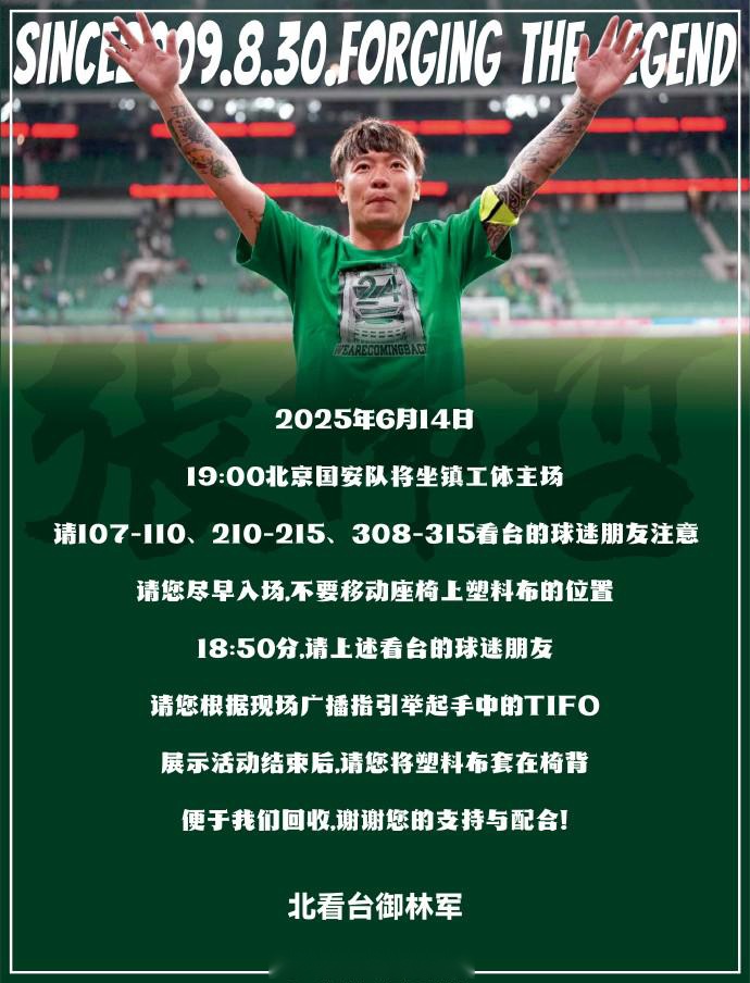 北京时间6月11日,著名国安球迷团体“御林军”发布官方社媒消息,称将在6月14日主场对阵青岛西海岸的比赛前展示张稀哲出战400场的纪念Tifo。