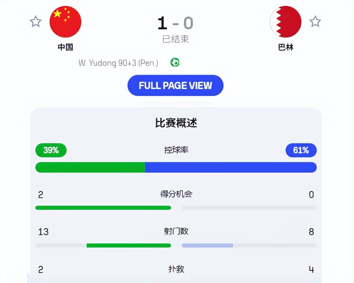从统计数据可以看到,国足控球率仅有39%,但是射门数上13比8领先,绝对得分机会也是2比0占优。