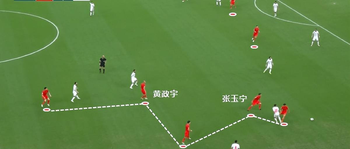 国足的进攻发起,总体上还是靠长传找前场,甚至最后一段用中卫韩鹏飞顶到前场,也是为了弥补张玉宁下场后留出的空缺。