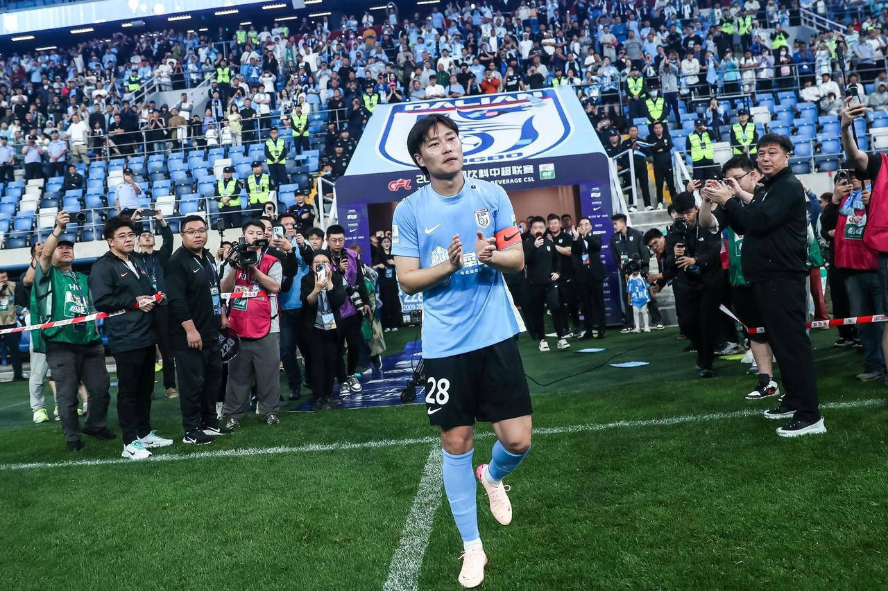 赛后,大连英博教练组、球员和俱乐部工作人员列队欢迎费煜入场,可以看到主帅李国旭、领队袁成哲、助教刘玉建等。
