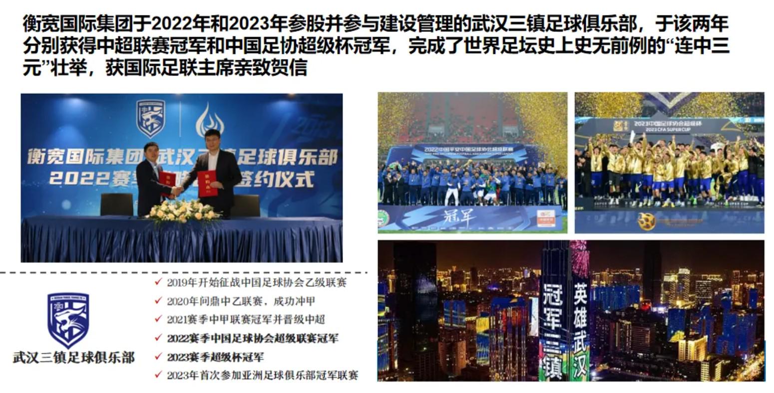 公告中写道: 衡宽国际集团曾深度参与中国足球事业,依据协议约定于2022年及2023年成为武汉三镇足球俱乐部的实际股东,并委派董事王芳女士出任俱乐部董事长,深度参与运营管理。 此期间,俱乐部于2022年荣膺中超联赛冠军、2023年夺得中国足协超级杯冠军。武汉三镇足球俱乐部于2020年至2022年连续夺得中乙、中甲、中超冠军,成就世界足坛史无前例的“连中三元”壮举,亦为湖北省建国以来首个夺得男子足球顶级联赛(中超)冠军的俱乐部,获国际足联主席亲致贺信。2022年12月31日,武汉市两江四岸亮起武汉三镇冠军主题灯光秀,成为湖北省年度标志性事件。
