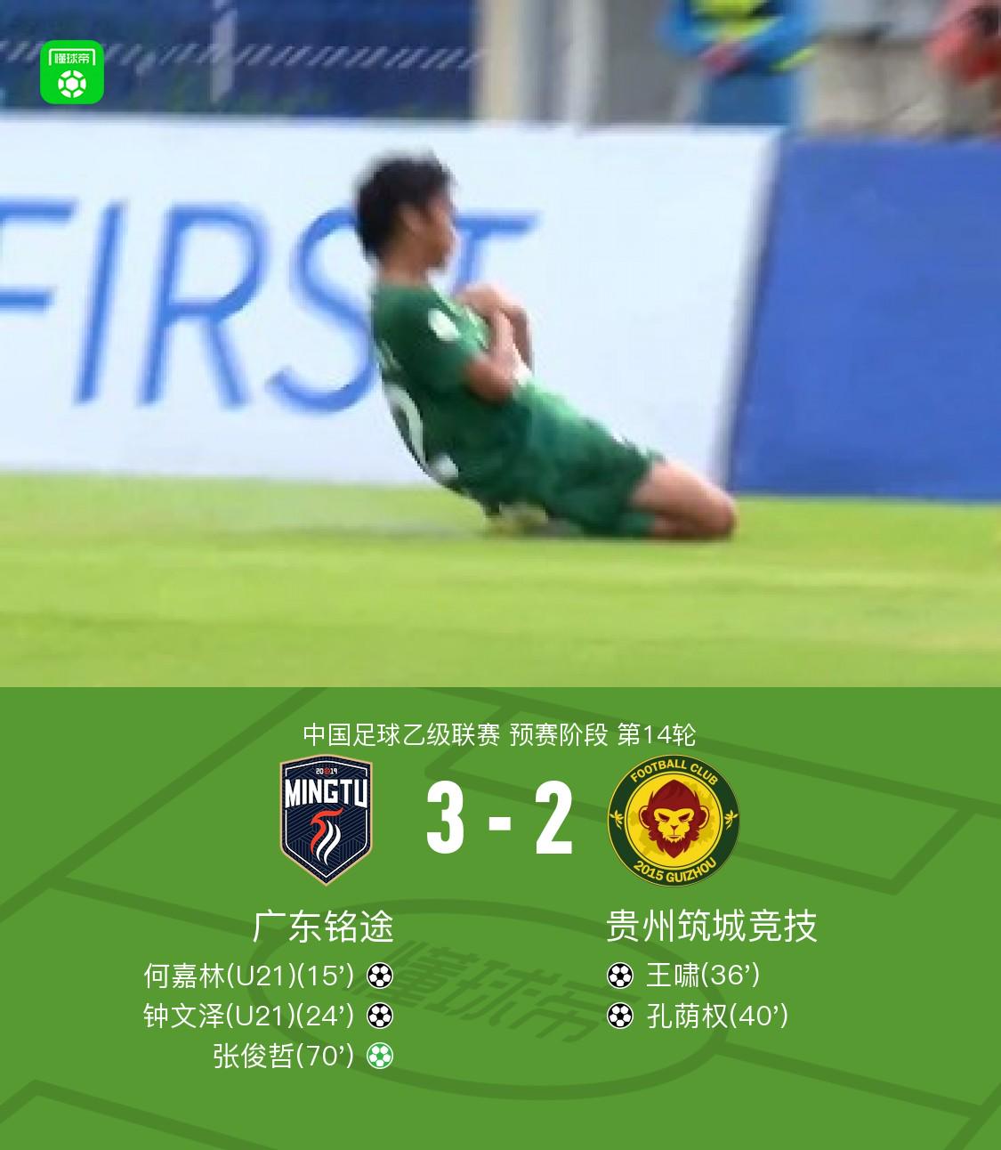 北京时间6月14日中国足球乙级联赛 预赛阶段 第14轮,广东铭途主场对阵贵州筑城竞技。广东铭途何嘉林破门,钟文泽破门,张俊哲破门。贵州筑城竞技王啸破门,孔荫权破门。最终比分广东铭途 3 - 2 贵州筑城竞技。