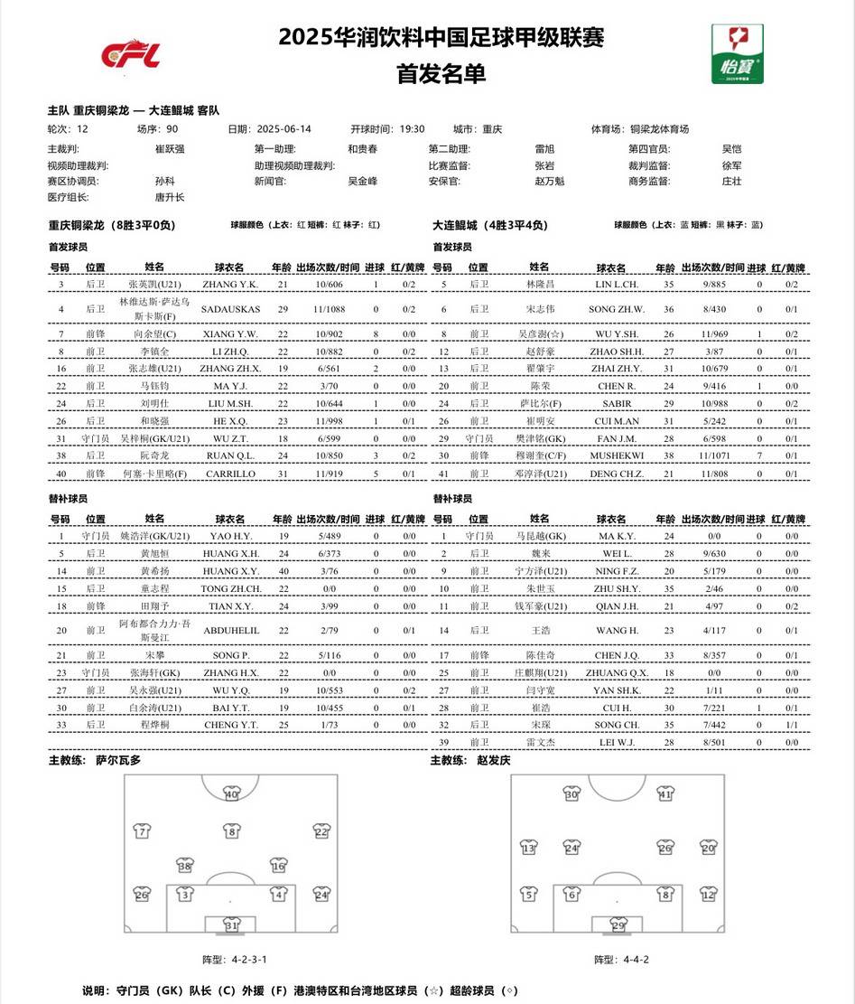 今晚(北京时间6月14日晚)19时30分,2025年中甲联赛第12轮的一场比赛在铜梁龙体育场上演,升班马大连鲲城做客山城,挑战冲击中超大热门重庆铜梁龙。