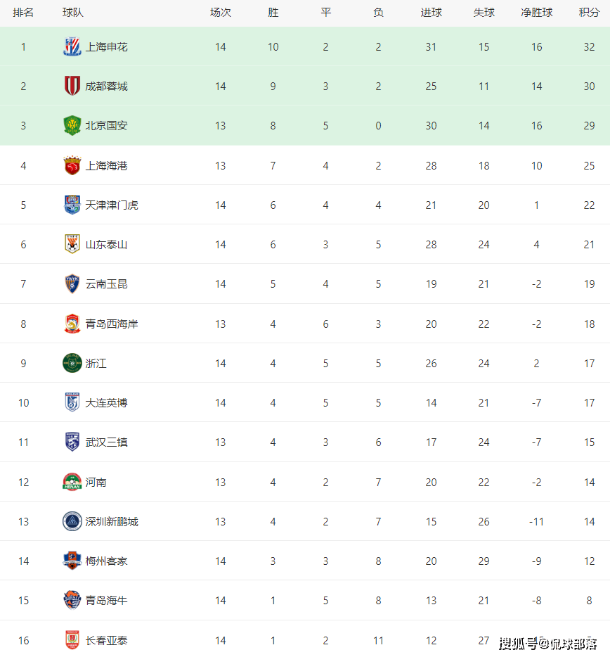 争冠格局有变,卫冕冠军上海海港开始掉队,上海申花依然2分优势领跑,成都蓉城紧随其后,少赛一轮的北京国安排名第三。