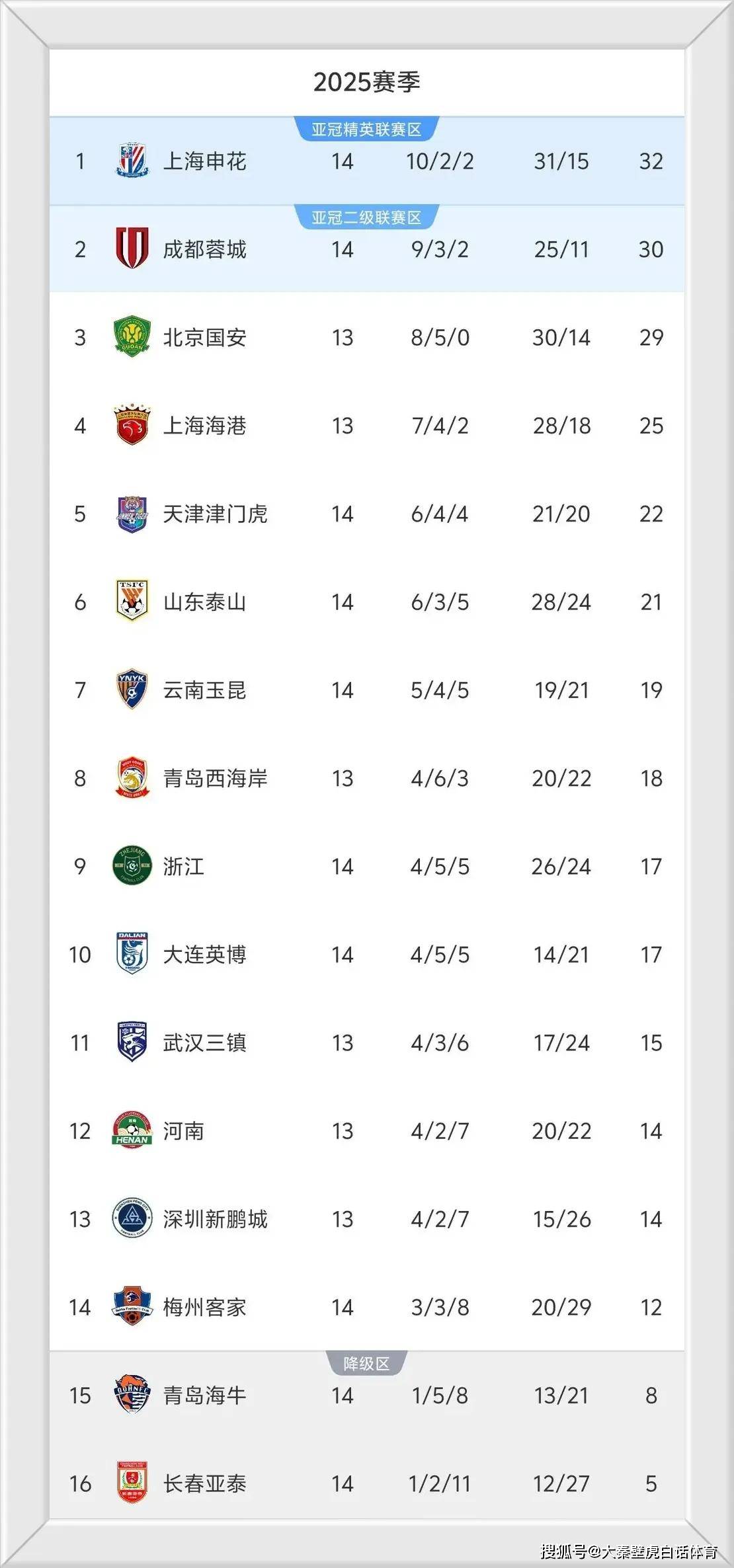 这第14轮联赛结束后,积分榜又有新变化。