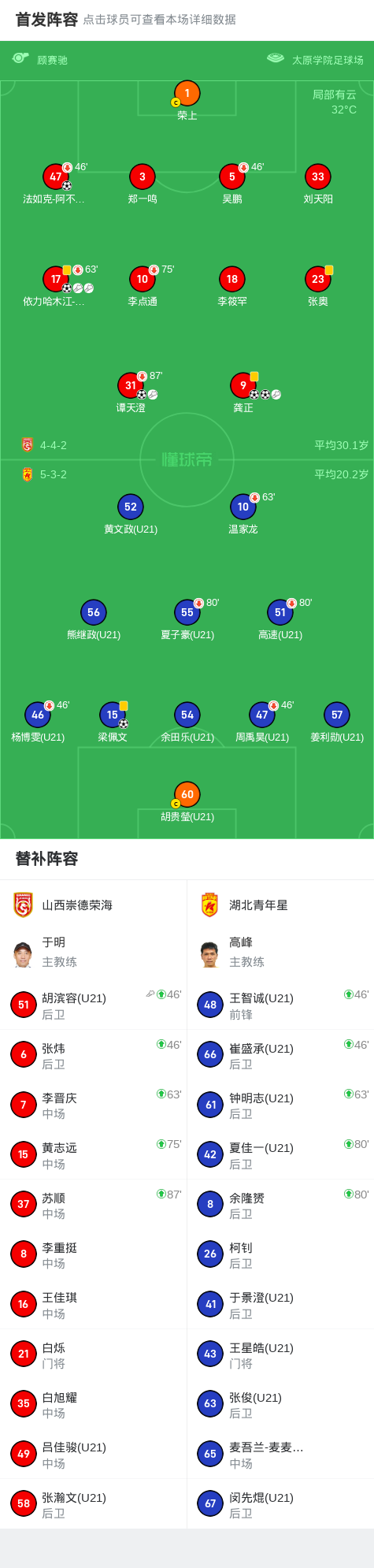 北京时间6月15日,中国足球乙级联赛预赛阶段第14轮,山西崇德荣海主场迎战湖北青年星。比赛中,山西崇德荣海展现强大攻势,依力哈木江-伊明江率先破门为球队打开局面,随后龚正两次建功完成梅开二度,法如克-阿不里米提锦上添花,谭天澄也在比赛尾声阶段取得进球。湖北青年星由梁佩文打入一球挽回些许颜面。最终,山西崇德荣海以5-1的比分战胜湖北青年星。