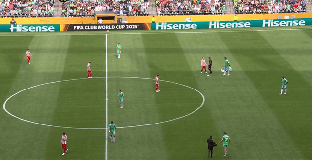 开场之后,实力占优的马竞很快占据优势,在场面上压制了对手。第11分钟,西蒙尼下底倒三角回传,巴里奥斯一脚爆射,皮球击中立柱后弹进球门,马竞早早打破僵局。第36分钟,西蒙尼突破制造点球,不过随后VAR介入,点球被取消,上半场马竞1-0暂时领先,球队在场面上占据了明显优势。
