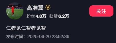 北京时间6月20日晚,2025中国足协杯1/8决赛,山东泰山主场1-3不敌成都蓉城,被淘汰出局。赛后,山东泰山球员高准翼在社交媒体里写道:“仁者见仁智者见智。”
