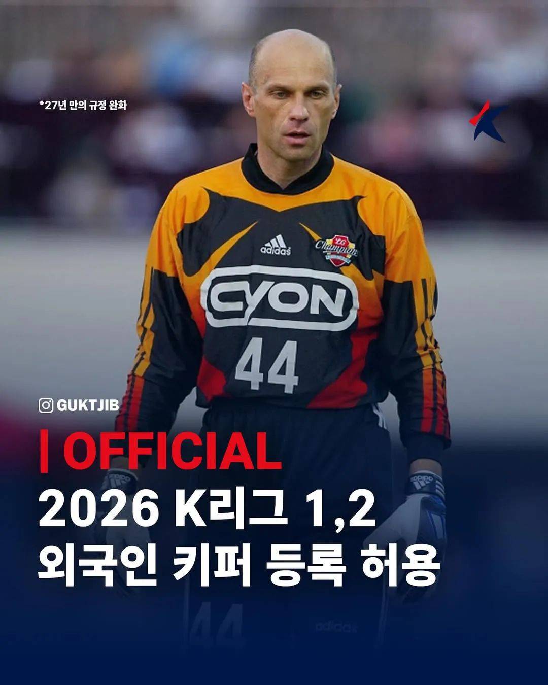 那时候,不会有太多人想到,这一制度竟然会持续整整27年。直到昨日,韩国职业足球联盟才官方宣布将解除已实施27年的外籍门将禁令,新政策将于2026赛季生效,适用于K1和K2联赛。